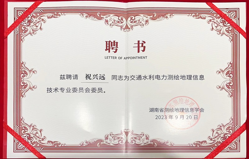 兹聘请 祝兴远同志 为交通水利电力测绘地理信息技术专业委员会委员,在此表示热烈祝贺。